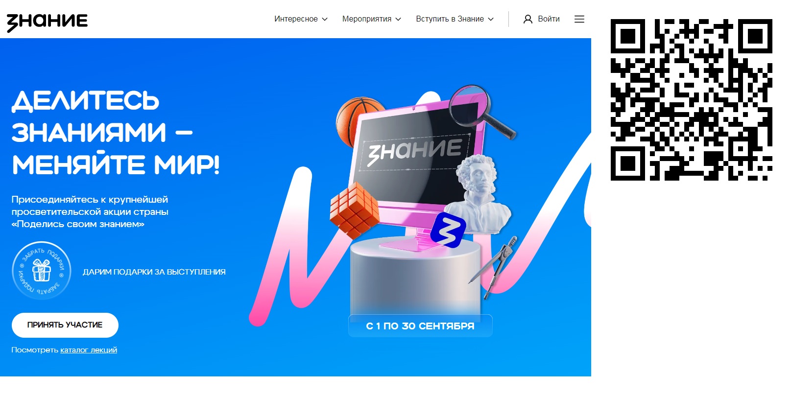 Российское общество «Знание» в период с 1 по 30 сентября 2025 г. проводит Всероссийскую просветительскую акцию «Поделись своим знанием». В рамках акции государственные и общественные деятели, преподаватели университетов, деятели культуры и успешные предприниматели поделятся своими знаниями и историями успеха в образовательных учреждениях страны.