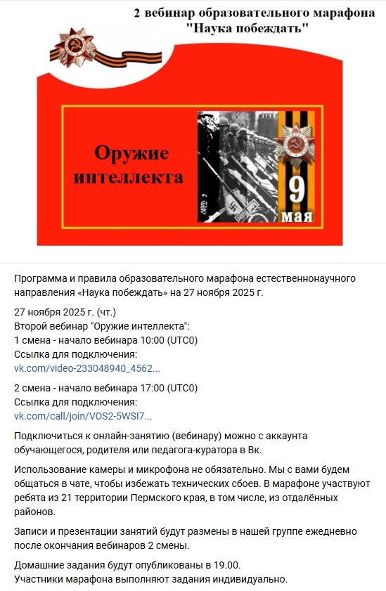 Тема марафона «Наука побеждать» была посвящена вкладу российских ученых в Победу в Великой Отечественной войне. В мероприятии приняли участие более 170 обучающихся 5-9 классов 18 территорий Пермского края. Программа марафона включала онлайн-вебинары по темам обучающие вебинары по темам: "Наука на линии фронта", "Оружие интеллекта", "Наследие Победы". По итогам занятий обучающиеся выполняли тематические тестовые задания и творческие практические работы.