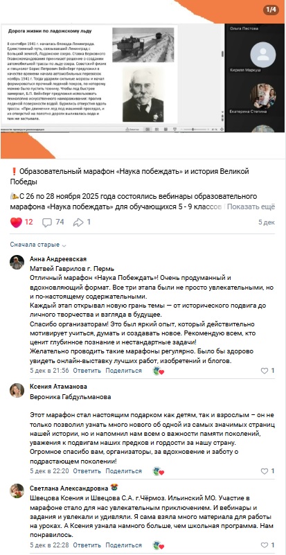 Участники марафона отметили, что он стал настоящим открытием и полностью оправдал своё название «Наука побеждать», ведь это была не просто серия заданий, а продуманная система, которая учила ставить цели, планировать действия и не сдаваться перед трудностями. Ребята узнали много нового о достижениях нашей науки в годы Великой Отечественной войны. А выполнять творческие работы было интересно и увлекательно. Подробнее ознакомиться с отзывами о марафоне можно в сообществе социальной сети Вк краевой заочной школы https://vk.com/kzshnoosphere?from=groups&w=wall-217168292_983.