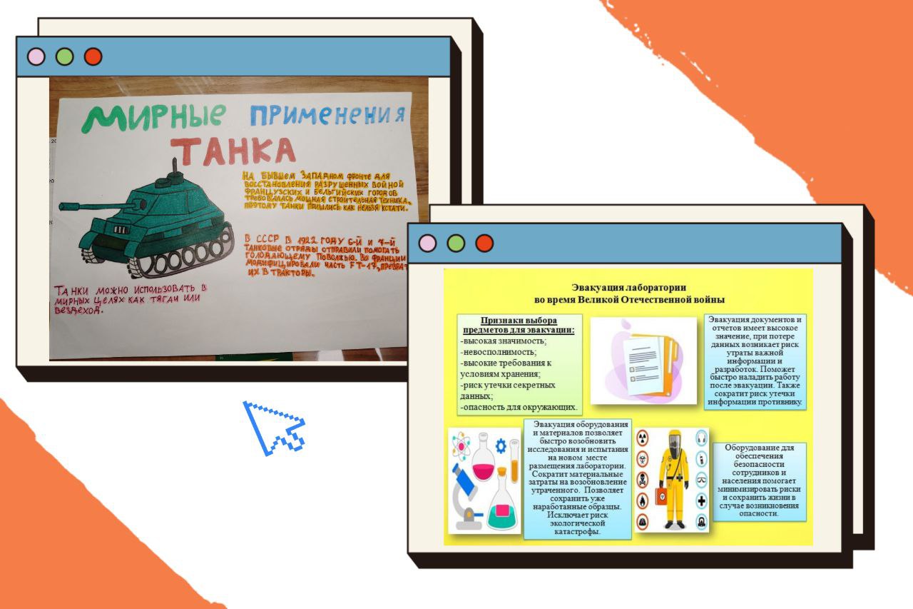 После завершения каждого из вебинаров участники марафона выполняли практические и творческие работы. В качестве творческого задания ребята разработали проект эвакуации научной лаборатории, придумали «мирные» изобретения для помощи фронту и подготовили посты для социальной сети. Работы получились яркими и содержательными. Обучающиеся продемонстрировали особый интерес к теме марафона и реализовали свой творческий потенциал на сто процентов.
