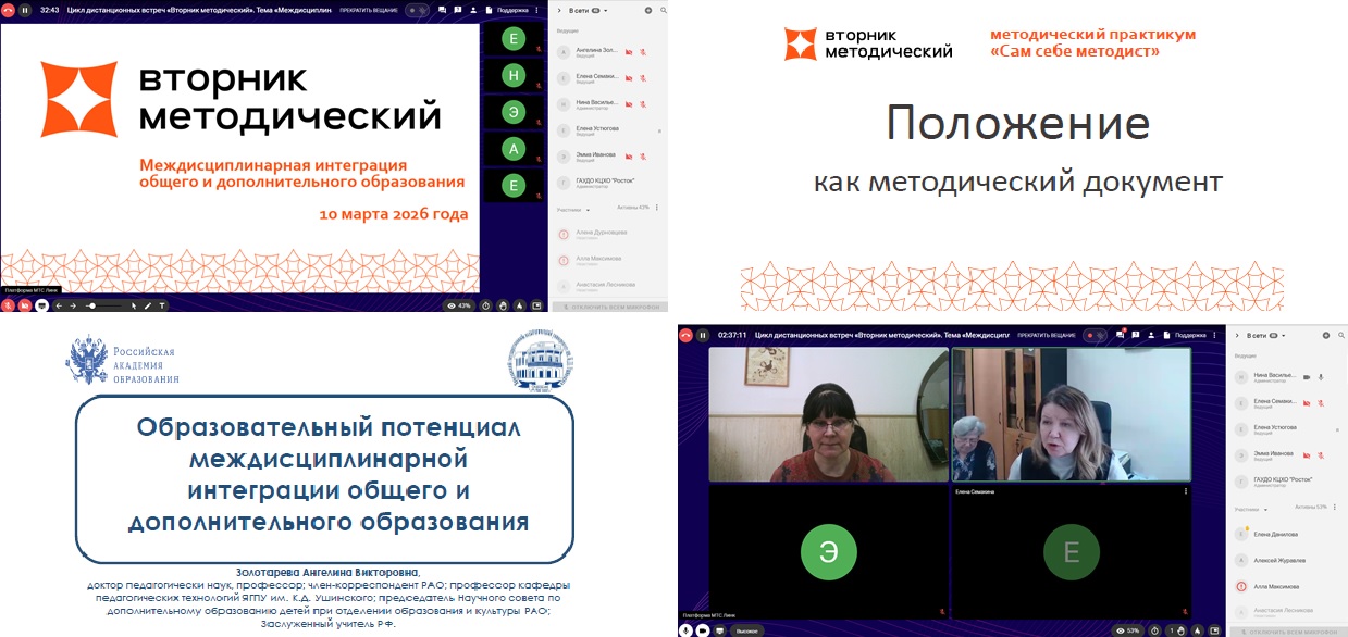 10 марта 2026 года состоялся очередной вебинар цикла дистанционных встреч «Вторник методический» для педагогических работников образовательных организаций. Встреча была был посвящена междисциплинарной интеграции общего и дополнительного образования». Спикерами выступили: